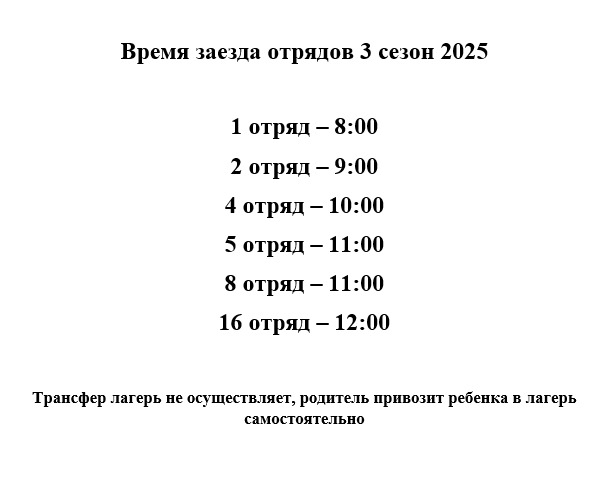 Выезд с 3 смены состоится 22 августа из лагеря. Выезд детей с 9:00 до 12:00 |